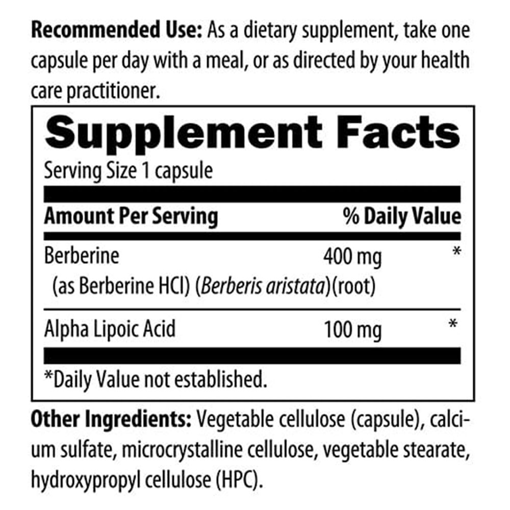 Berberine Complex supplies high-potency Berberine combined with alpha-lipoic acid to help support optimal blood sugar and insulin levels, cardiovascular health and liver health.** It is an alkaloid compound found in the roots, rhizomes, stems and bark of several plants commonly used in botanical and Chinese medicine, such as goldenseal, Oregon grape, barberry, and Berberis aristata.
